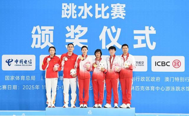 11月11日,第十五届全国运动会跳水项目女子3米跳板决赛在广州举行。冠军广东队选手林珊(左三),亚军四川队选手陈佳(左一)和季军广东队选手陈艺文(右二)以及教练员在领奖台上合影。